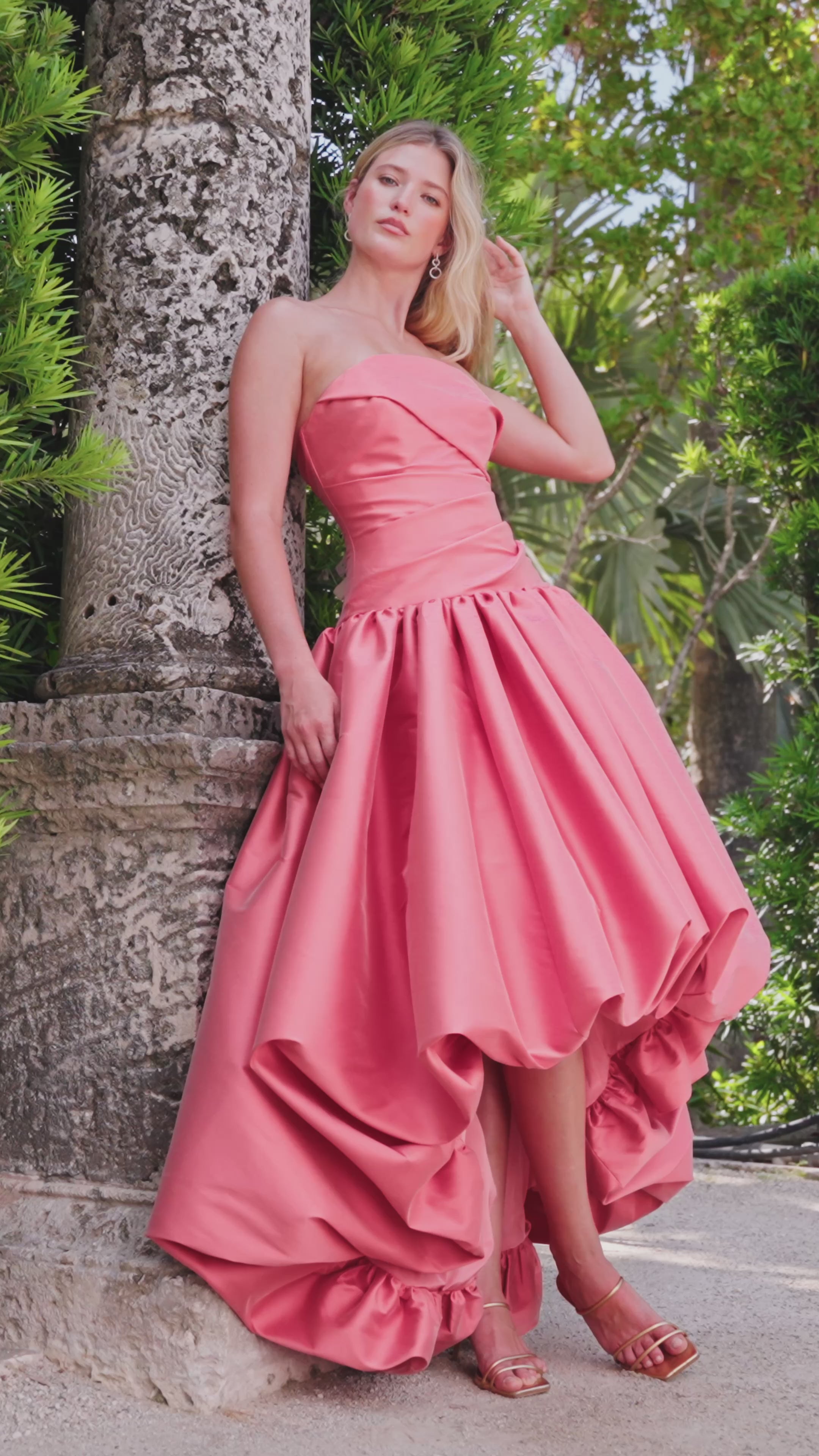 The Consuelo evening gown from Black Label by Anne Barge is an arched strapless drop waist bodice with asymmetrical draping and high-low bubble hem gathered skirt in Stretch Twill. Available in Coral, Pink, Tangerine, Teal and in sizes 0-22 and 16SP-24SP. Shown in Coral.