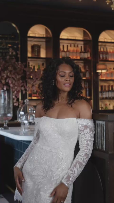 Strapless peak neckline with an A-line mini skirt made of dimensional rose motif beading and featuring detachable draped long sleeves.